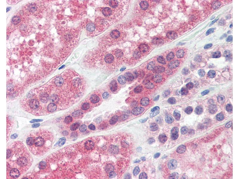 Usage: Immunohistochemistry: This antibody was validated for use in immunohistochemistry on a panel of 21 formalin-fixed, paraffin-embedded (FFPE) human tissues after heat induced antigen retrieval in pH 6.0 citrate buffer. After incubation with the primary antibody, slides were incubated with biotinylated secondary antibody, followed by alkaline phosphatase-streptavidin and chromogen. The stained slides were evaluated by a pathologist to confirm staining specificity. The optimal working concentration for this antibody was determined to be 15 μg/mL. -