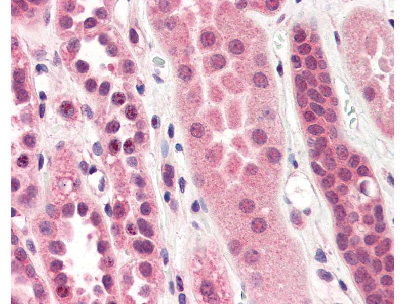 Usage: Immunohistochemistry: This antibody was validated for use in immunohistochemistry on a panel of 21 formalin-fixed, paraffin-embedded (FFPE) human tissues after heat induced antigen retrieval in pH 6.0 citrate buffer. After incubation with the primary antibody, slides were incubated with biotinylated secondary antibody, followed by alkaline phosphatase-streptavidin and chromogen. The stained slides were evaluated by a pathologist to confirm staining specificity. The optimal working concentration for this antibody was determined to be 10 μg/mL. -