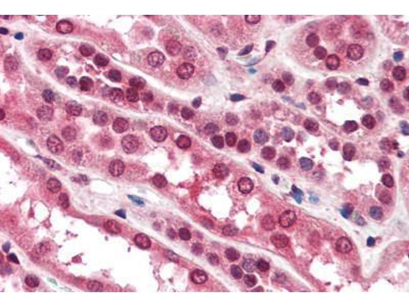 Usage: Immunohistochemistry: This antibody was validated for use in immunohistochemistry on a panel of 21 formalin-fixed, paraffin-embedded (FFPE) human tissues after heat induced antigen retrieval in pH 6.0 citrate buffer. After incubation with the primary antibody, slides were incubated with biotinylated secondary antibody, followed by alkaline phosphatase-streptavidin and chromogen. The stained slides were evaluated by a pathologist to confirm staining specificity. The optimal working concentration for this antibody was determined to be 10 μg/mL. -