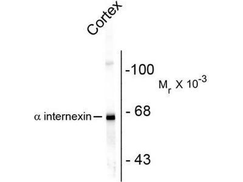 - Specific for the ~66k alpha Internexin protein. Minor bands at ~150k are probably covalent dimers and bands at ~50k represent Alpha-Internexin breakdown products.