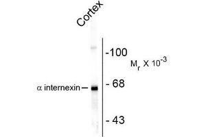 - Alpha-internexin is a Class IV intermediate filament originally discovered as it co-purifies with other neurofilament subunits (1). Alpha-internexin is related to but distinct from the better known neurofilament triplet proteins, NF-L, NF-M and NF-H, having similar protein sequence motifs and a similar intron organization. It is expressed only in neurons and in large amounts early in neuronal development, but is down-regulated in many neurons as development proceeds. Many classes of mature neurons contain alpha-internexin in addition to NF-L, NF-M and NF-H. In some mature neurons alpha-internexin is the only neurofilament subunit expressed. Antibodies to alpha-internexin are therefore unique probes to study and classify neuronal types and follow their processes in sections and in tissue culture. In addition, recent studies show a marked up-regulation of alpha-internexin during neuronal regeneration (2). The use of antibodies to this protein in the study of brain tumors has not been examined to date, but is likely to be of interest. Recently Cairns et al. used this antibody to show that alpha-internexin is an abundant component of the inclusions of neurofilament inclusion body disease (NFID), a serious human neurodegenerative disorder (3,4). The antibody was also used to confirm the presence of circulating auto-antibodies to alpha-internexin in the sera of some patients with endocrine autoimmunity, as well as in some normal individuals (5).Synonyms: 66 kDa neurofilament protein, Alpha-Inx, INA, NEF5, NF66, Neurofilament-66
