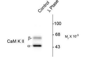 Specific for the ~50k Alpha-CaM Kinase II and the ~60k Beta-CaM Kinase II proteins phosphorylated at Thr286. Immunolabeling is blocked by the lambda-phosphatase treatment.