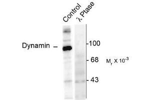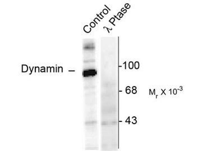 - Specific for the ~95k Dynamin protein phosphorylated at Ser774. This antiboy labels the purified protein phosphorylated in vitro by CDK5 but not by PKC. Does not cross react with other purified substrates of CDK5 (e.g. Amphiphysin and Synapsin). Immunolabeling is blocked by lambda-phosphatase treatment.