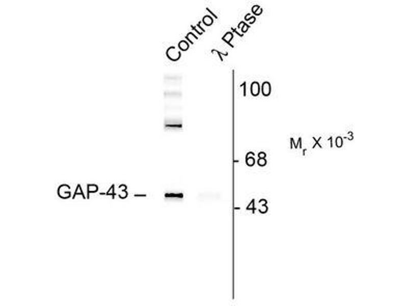 Specific for the ~50k Gap-43 protein phosphorylated at Ser41 in Western Blots of Rat brain lysate. In some tissues the antibody also recognizes a higher molecular weight protein that is also recognized by the pan Gap-43 antibody, that may be a Gap-43 aggregate or oligomer. Immunolableing is blocked by the phosphopeptide used as antigen but not by the corresponding dephosphopeptide. Immunolabeling is completely eliminated by treatment with lambda-Ptase.