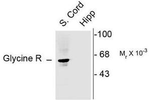 This antibody recognizes the ~48k alpha-1 and alpha-2 Subunits of the Glycine Receptor in Western blots of rat spinal cord and brain stem and in cell extracts. Immunolabeling blocked by preadsorption of antibody with the peptide immunogen. Does not recognize other Glycine Receptor subunits.