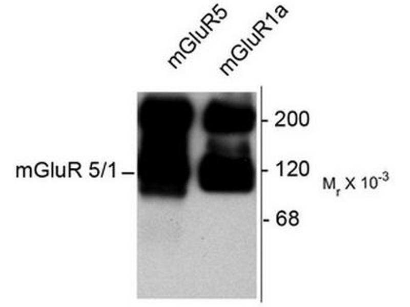 The metabotropic glutamate receptors (mGluRs) are key receptors in the modulation of excitatory synaptic transmission in the central nervous system. They are implicated in many forms of neural plasticity as well as learning and memory and drug abuse (Bhattacharya et al., 2004, Francesconi et al., 2004, Wilson and Nicoll, 2001). Group I metabotropic glutamate receptors (consisting of mGluR1 and mGluR5) are G-protein-coupled neurotransmitter receptors that are localized in the perisynaptic region of the postsynaptic membrane. When activated, Group I mGluRs lead to stimulation of phospholipase and activation of Protein Kinase C. In contrast, activation of Group II metabotropic receptors (mGluR2 and mGluR3) leads to inhibition of adenylate cyclase. The mGluR1 receptor may also be critically involved in limiting the deleterious effects of excitotoxicity (Blaabjerg et al., 2003). In contrast, the mGluR5 receptor appears to be essential for late phase LTP in area CA1 of the hippocampus (Francesconi et al., 2004).Synonyms: GRM1A, GRM5, MGLUR1a, MGLUR5, Metabotropic Glutamate Receptor 5/1a