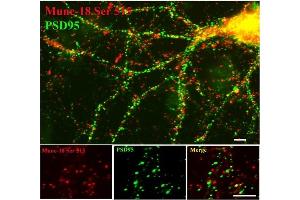 Munc-18 (mammalian homologue of Unc-18) is a protein that is thought to be involved in regulating exocytosis due, at least in part, to it ability to bind syntaxin (Ciufo et al., 2005). Munc18-1 is a neuron-specific member of the Sec1/Munc18 protein family that binds to syntaxin1A and is thought to stabilize the complex (Liu et al., 2004). The function of Munc-18 is thought to be regulated by PKC phosphorylation of Ser515 on the Munc-18 protein (Sassa et al., 1996). Alternate names: N-Sec1, Syntaxin-binding protein 1, Unc-18 homolog, Unc-18-1, Unc-18A