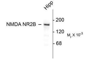 This antibody recognizes the ~180k NR2B subunit of the NMDA receptor. No reactivity towards the NR2A and NR2C subunits. Immunolabeling is blocked by pre-adsorption of antibody with the fusion protein used to generate the antibody.