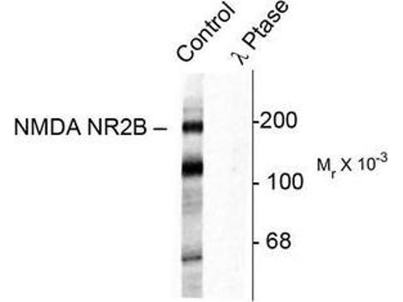 This antibody is specific for the ~180k NMDAR NR2B-subunit protein phosphorylated at Tyr1472 in Western blots. The antibody also labels proteins of ~65k and ~115k. Immunolabeling is completely blocked by blocked by either lambda-Ptase or by the phosphopeptide used as the antigen but not by the corresponding dephosphopeptide.
