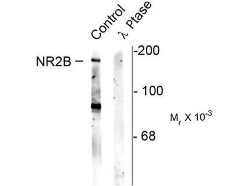 This antibody recognizes the ~180k NMDAR NR2B subunit protein phosphorylated at Ser1480. Immunolabeling of the NMDA NR2B subunit band is blocked by the phosphopeptide used as the antigen but not by the corresponding dephosphopeptide. Immunolabeling is also blocked by lambda-phosphatase treatment.
