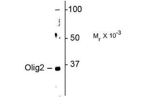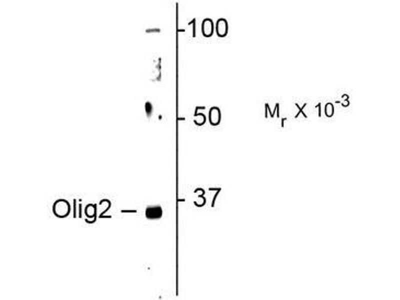 Olig2 is a transcription factor which is required for oligodendrocyte and motor neuron specification in the spinal cord, as well as for the development of somatic motor neurons in the hindbrain. Expressed in the ventral spinal cord as early as 9.5 dpc and scattered in the mantle zone, likely corresponding to oligodendrocyte progenitors migrating out from their site of origin. From 10.5 through 14.5 dpc, Olig2 is expressed in numerous cells in the ventricular and subventricular zones of the lateral and medial ganglionic eminences, suggesting that expression might not be limited to the oligodendrocytic lineage. Olig2 has further been shown to be critical in the proliferation of malignant glioma in brain tumors (Ligon et al., 2007).Synonyms: BHLHB1, Class B basic helix-loop-helix protein 1, OLIG2, Oligo2, Oligodendrocyte transcription factor 2, PRKCBP2, Protein kinase C-binding protein 2, Protein kinase C-binding protein RACK17, RACK17, bHLHB1