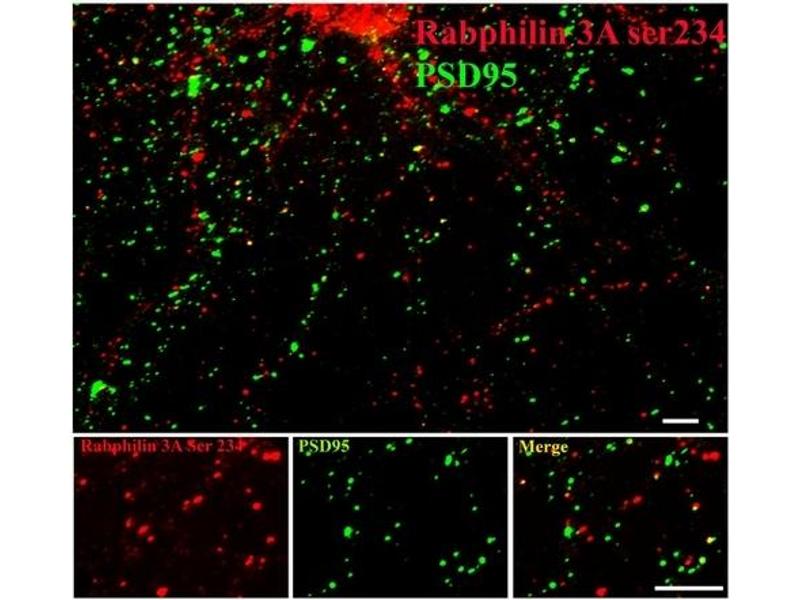 - This antibody recognizes the ~82k Rabphilin protein phosphorylated at Ser234. The immunolabeling of the Rabphilin band was completely blocked by the phosphopeptide used as antigen while the dephosphopeptide had no effect on the immunolabeling.