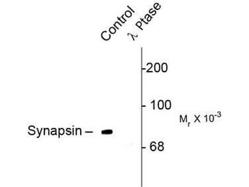 - This antibody recognizes the ~78k Synapsin I doublet protein phosphorylated at Ser549. Immunolabeling of the synapsin I band is blocked by lambda-phosphatase treatment.