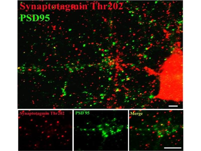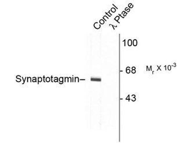 - This antibody recognizes the ~60k-62k synaptotagmin protein phosphorylated at Thr202 in Western Blots of Rat brain lysate. The immunolabeling is completely eliminated by lambda-phosphatase treatment.