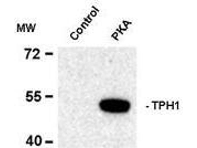 Tryptophan Hydroxylase (TPH) catalyzes the 5-hydroxylation of tryptophan, which is the first step in the biosynthesis of indoleamines (serotonin and melatonin) (Martinez et al., 2001). In mammals, serotonin biosynthesis occurs predominantly in neurons which originate in the Raphe nuclei of the brain, and melatonin synthesis takes place within the pineal gland. Although TPH catalyzes the same reaction within the Raphe nuclei and the pineal gland, TPH activity is rate-limiting for serotonin but not melatonin biosynthesis. Serotonin functions mainly as a neurotransmitter, whereas melatonin is the principal hormone secreted by the pineal gland. The activity of TPH is enhanced by phosphorylation by cAMP-dependent protein kinase (PKA) and Ca2+/calmodulin kinase II (CaM K II) (Jiang et al., 2000, Johansen et al., 1996) Both PKA and CaM K II phosphorylate Ser58 which lies within the regulatory domain of TPH (Kuhn et al., 1997).Synonyms: TPRH, TRPH, Tryptophan 5-monooxygenase 1