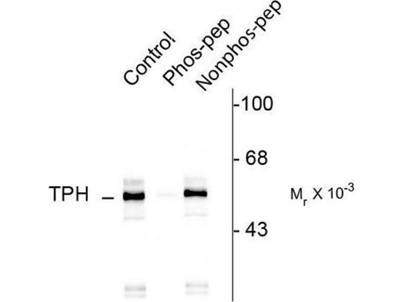 Tryptophan Hydroxylase (TPH) catalyzes the 5-hydroxylation of tryptophan, which is the first step in the biosynthesis of indoleamines (serotonin and melatonin) (Martinez et al., 2001). In mammals, serotonin biosynthesis occurs predominantly in neurons which originate in the Raphe nuclei of the brain, and melatonin synthesis takes place within the pineal gland. Although TPH catalyzes the same reaction within the Raphe nuclei and the pineal gland, TPH activity is rate-limiting for serotonin but not melatonin biosynthesis. Serotonin functions mainly as a neurotransmitter, whereas melatonin is the principal hormone secreted by the pineal gland. The activity of TPH is enhanced by phosphorylation by cAMP-dependent protein kinase (PKA) and Ca2+/calmodulin kinase II (CaM K II) (Jiang et al., 2000, Johansen et al., 1996). CaM K II phosphorylates Ser260 which lies within the regulatory domain of TPH (Jiang et al., 2000).Synonyms: TPRH, TRPH, Tryptophan 5-monooxygenase 1