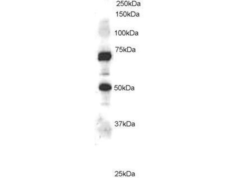 Peptide ELISA: Limit dilution 1: 32000. Western blot: Recommended for use at 1-2 μg/mL. Approx 70 kDa and 50 kDa bands seen inJurkat cell lysate. Note the smaller isoform of this protein has a consensus glycosylationsite, which may explain the higher than expected band size (50 kDa versus 30 kDa). Glycosylation can affect migration of proteins on SDS-PAGE [Hames, B. D and Rickwood, D. ,eds. Gel electrophoresis of proteins: a practical approach. Oxford University Press].