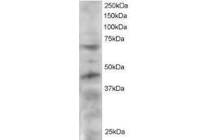 Peptide ELISA: Limit dilution 1: 8000. Western blot: 1-3 μg/mL. Approx 60-65 kDa and 45 kDa bands seen in HeLa lysate.
