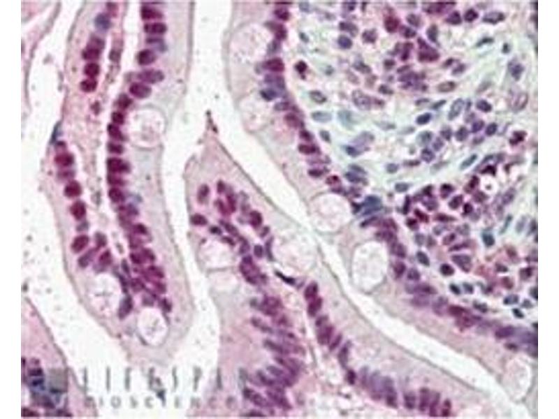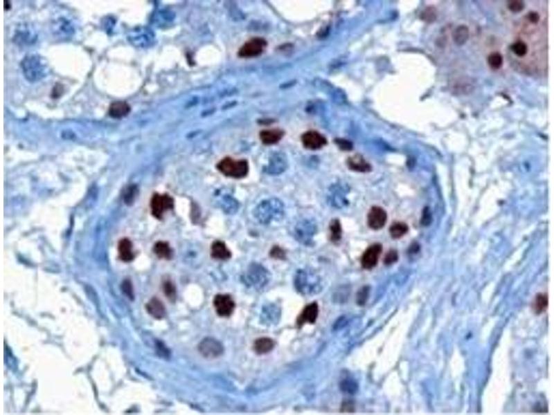 Peptide ELISA: Limit dilution 1: 32000. Western blot: 0.2-1 μg/mL. Approx 55-60 kDa band observed in Human Testis and Ovarylysates (predicted size of approx.50 kDa according to NP_002259.1). Immunohistochemistry: In paraffin embedded Human Testis, shows strong nuclearstaining of some cells in the seminiferous tubules (3 μg/mL). In paraffin embedded HumanSmall Intestine shows pixulate staining in nuclei of enterocytes (1-2 μg/mL). Other applications not tested. Optimal dilutions are dependent on conditions and should be determined by the user.