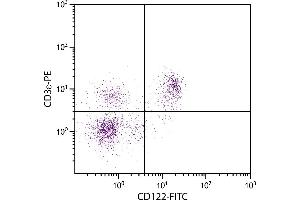 The IL-2 receptor is a complex of three distinct polypeptide chains: (i) the α chain which binds IL-2 with low affinity, (ii) the β chain that binds IL-2 with high affinity, and (ii) the common γ chain ( γ C ) that does not bind IL-2. The high affinity receptor complex is an α / β / γ heterotrimer with a K d of 1.3 x 10 -11 M. 2 In mouse spleen, CD122 is expresed on approx. 30 % of CD8 + cells and all NK cells, but < 1 % of B cells and CD4 + T lymphocytes. In the thymus, its expression is confined to CD4 - CD8 + single positive and CD4 - CD8 - double negative cells. 4 Cytoplasmic regions of the IL-2R β chain are involved in IL-2-mediated cellular signaling and, via the interaction of IL-2 and its receptor complex, may be involved in the generation and differentiation of T lymphocytes.
