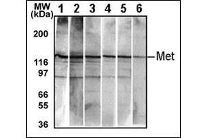 The proto-oncogene MET product is the hepatocyte growth factor receptor and encodes tyrosine-kinase activity. The primary single chain precursor protein is post-translationally cleaved to produce the alpha and beta subunits, which are disulfide linked to form the mature receptor. Various mutations in the MET gene are associated with papillary renal carcinoma. Two transcript variants encoding different isoforms have been found for this gene.