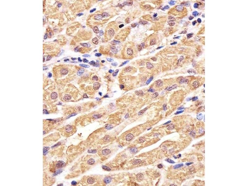 This GSS antibody is generated from rabbits immunized with a KLH conjugated synthetic peptide between 372-400 amino acids from the C-terminal region of human GSS.
