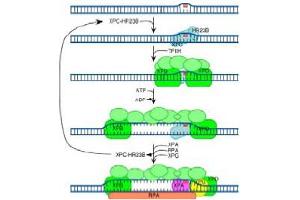 HR23B (also known as UV excision repair protein RAD23 homolog B, XP-C repair complementing complex 58 kDa protein and p58) is one of two human homologs of Saccharomyces cerevisiae Rad23 (hHR23A and hHR23B), a protein involved in nucleotide excision repair (NER). This protein was shown to interact with, and elevate the nucleotide excision activity of 3-methyladenine-DNA glycosylase (MPG), which suggested a role in DNA damage recognition in base excision repair. This protein contains an N-terminal ubiquitin-like domain, which was reported to interact with 26S proteasome, as well as with ubiquitin protein ligase E6AP, and thus suggests that this protein may be involved in the ubiquitin mediated proteolytic pathway in cells.Synonyms: HR23B, UV excision repair protein RAD23 homolog B, XP-C repair-complementing complex 58 kDa protein