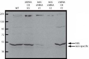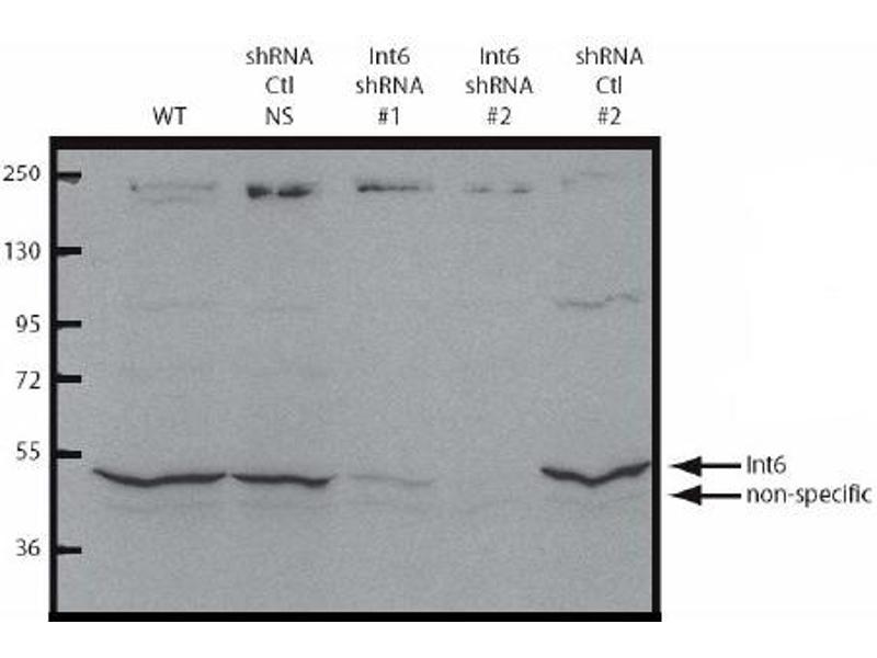 Suitable for use in ELISA (1/80,000) and Western Blot (1/1,000). Expect a band approx. 48 kDa in size corresponding to eIF3S6/Int6 by Western blotting in theappropriate cell lysate or extract. This antibody is capable of detecting bothover-expressed and endogenous eIF3S6/Int6.