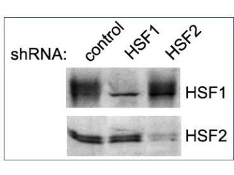 - HSF2, or heat shock factor 2, belongs to a family of Heat Shock transcription factors that activate the transcription of genes encoding products required for protein folding, processing, targeting, degradation, and function (2). The up-regulation of HSP (heat shock proteins) expression by stressors is achieved at the level of transcription through a heat shock element (HSE) and a transcription factor (HSF) (3, 4, 5). Most HSFs have highly conserved amino acid sequences. On all HSFs there is a DNA binding domain at the Nterminus. Hydrophobic repeats located adjacent to this binding domain are essential for the formation of active trimers. Towards the C-terminal region another short hydrophobic repeat exists, and is thought to be necessary for suppression of trimerization (6). There are two main heat shock factors, 1 and 2. Mouse HSF1 exists as two isoforms, however in higher eukaryotes HSF1 is found in a diffuse cytoplasmic and nuclear distribution in un-stressed cells. Once exposed to a multitude of stressors, it localizes to discrete nuclear granules within seconds. As it recovers from stress, HSF1 dissipates from these granules to a diffuse nuceloplasmic distribution. HSF2 on the other hand is similar to mouse HSF1, as it exists as two isoforms, the alpha form being more transciptionally active than the smaller beta form (7, 8). Various experiments have suggested that HFS2 may have roles in differentiation and development (9, 10, 11).Synonyms: HSF-2, HSTF2, Heat shock transcription factor 2