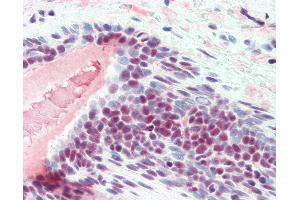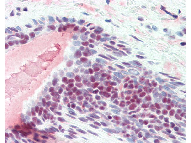 Usage: Immunohistochemistry: This antibody was validated for use in immunohistochemistry on a panel of 21 formalin-fixed, paraffin-embedded (FFPE) human tissues after heat induced antigen retrieval in pH 6.0 citrate buffer. After incubation with the primary antibody, slides were incubated with biotinylated secondary antibody, followed by alkaline phosphatase-streptavidin and chromogen. The stained slides were evaluated by a pathologist to confirm staining specificity. The optimal working concentration for this antibody was determined to be 10 μg/mL. Western Blot: 1-3 μg/mL. A band of ~33kD is seen with doublet or triplet bands sometimes evident due to phosphorylation differences. -