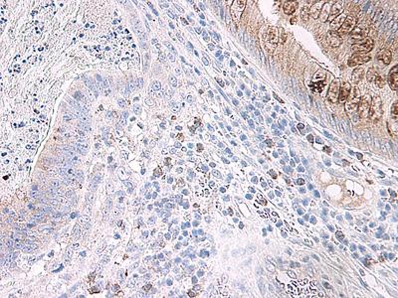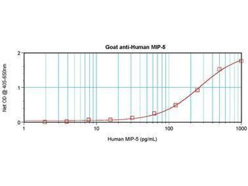 Usage: Immunohistochemistry: This antibody stained formalin-fixed, paraffin-embedded sections of human colon/rectum adenocarcinoma. The recommended concentration is 0.5 μg/mL with an overnight incubation at 4 °C. An HRP-labeled polymer detection system was used with a DAB chromogen. Heat induced antigen retrieval with a pH 6 sodium citrate buffer is recommended. Optimal concentrations and conditions may vary. Tissue samples were provided by the Cooperative Human Tissue Network, which is funded by the National Cancer Institute. Neutralization: To yield one-half maximal inhibition [ND] of the biological activity of hMIP-5 (50 ng/mL), a concentration of 1.75-3 μg/mL of this antibody is required. ELISA: To detect hMIP-5 by sandwich ELISA (using 100 μL/well antibody solution) a concentration of 0.5-2 μg/mL of this antibody is required. This antigen affinity purified antibody, in conjunction with Biotinylated Anti-Human MIP-5 (LS-C104743) as a detection antibody, allows the detection of at least 0.2-0.4 ng/well of recombinant hMIP-5. Western Blot: To detect hMIP-5 by Western Blot analysis this antibody can be used at a concentration of 0.1-0.2 μg/mL. Used in conjunction with compatible secondary reagents the detection limit for recombinant hMIP-5 is 1.5-3 ng/lane, under either reducing or non-reducing conditions. -