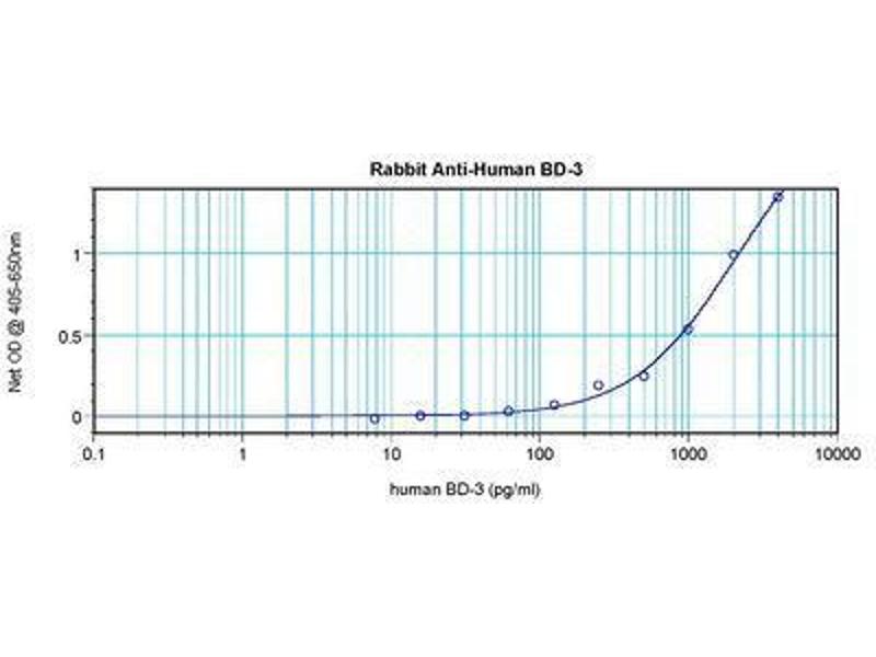 Usage: ELISA: To detect hBD-3 by sandwich ELISA (using 100 μL/well antibody solution) a concentration of 0.5-2 μg/mL of this antibody is required. This antigen affinity purified antibody, in conjunction with Biotinylated Anti-Human BD-3 (LS-C104286) as a detection antibody, allows the detection of at least 0.2-0.4 ng/well of recombinant hBD-3. Western Blot: To detect hBD-3 by Western Blot analysis this antibody can be used at a concentration of 0.1-0.2 μg/mL. Used in conjunction with compatible secondary reagents the detection limit for recombinant hBD-3 is 1.5-3 ng/lane, under either reducing or non-reducing conditions. -