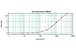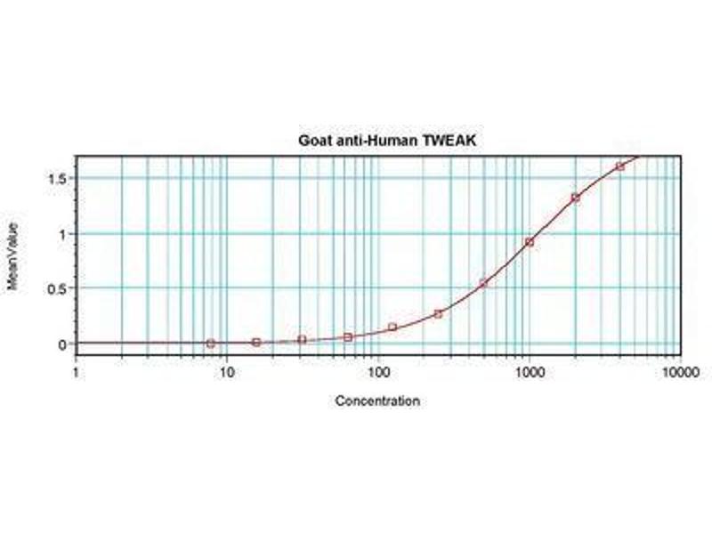 Usage: Neutralization: To yield one-half maximal inhibition [ND50] of the biological activity of hTWEAK (200 ng/mL), a concentration of 0.1-0.2 μg/mL of this antibody is required. ELISA: To detect hTWEAK by sandwich ELISA (using 100 μL/well antibody solution) a concentration of 0.5-2 μg/mL of this antibody is required. This antigen affinity purified antibody, in conjunction with Biotinylated Anti-Human TWEAK (LS-C104282) as a detection antibody, allows the detection of at least 0.2-0.4 ng/well of recombinant hTWEAK. Western Blot: To detect hTWEAK by Western Blot analysis this antibody can be used at a concentration of 0.1-0.2 μg/mL. Used in conjunction with compatible secondary reagents the detection limit for recombinant hTWEAK is 1.5-3 ng/lane, under either reducing or or non-reducing conditions. -