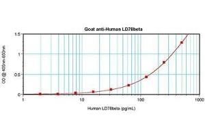 Usage: ELISA: To detect Human LD78beta by sandwich ELISA (using 100 μL/well antibody solution) a concentration of 0.5-2 μg/mL of this antibody is required. This antigen affinity purified antibody, in conjunction with Biotinylated Anti-Human LD78beta (LS-C104482) as a detection antibody, allows the detection of at least 0.2-0.4 ng/well of recombinant Human LD78beta. Western Blot: To detect Human LD78beta by Western Blot analysis this antibody can be used at a concentration of 0.1-0.2 μg/mL. When used in conjunction with compatible secondary reagents, the detection limit for recombinant Human LD78beta is 1.5-3 ng/lane, under either reducing or non-reducing conditions. -