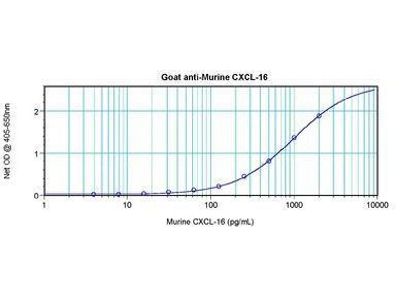 Usage: ELISA: To detect mCXCL16 by sandwich ELISA (using 100 μL/well antibody solution) a concentration of 0.5-2 μg/mL of this antibody is required. This antigen affinity purified antibody, in conjunction with Biotinylated Anti-Murine CXCL16 (LS-C104579) as a detection antibody, allows the detection of at least 0.2-0.4 ng/well of recombinant mCXCL16. Western Blot: To detect mCXCL16 by Western Blot analysis this antibody can be used at a concentration of 0.1-0.2 μg/mL. Used in conjunction with compatible secondary reagents the detection limit for recombinant mCXCL16 is 1.5-3 ng/lane, under either reducing or non-reducing conditions. -