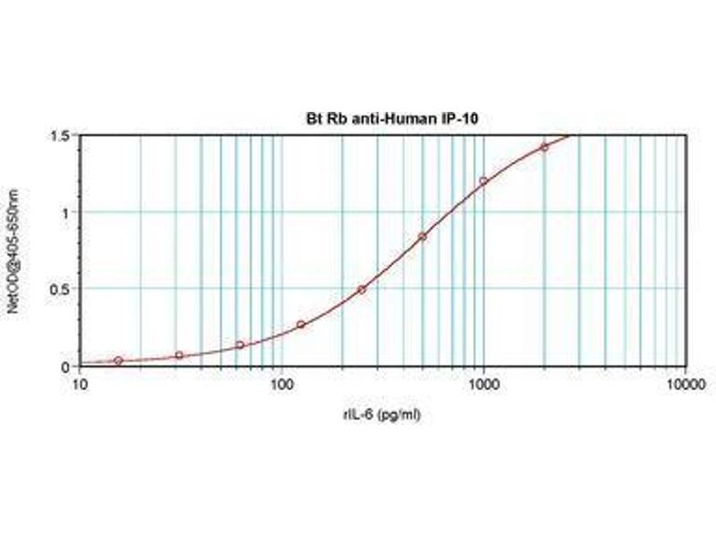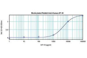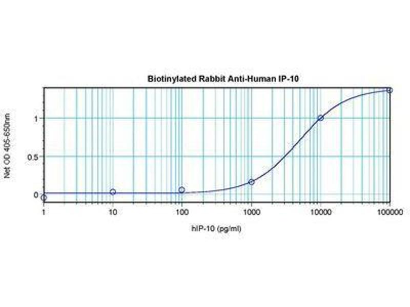 Usage: The applications listed have been tested for the unconjugated form of this product. Other forms have not been tested. ELISA: To detect hIP-10 by direct ELISA (using 100 μL/well antibody solution) a concentration of 0.25-1 μg/mL of this antibody is required. This biotinylated polyclonal antibody, in conjunction with compatible secondary reagents, allows the detection of at least 0.2-0.4 ng/well of recombinant hIP-10. To detect hIP-10 by sandwich ELISA (using 100 μL/well antibody solution) a concentration of 0.25-1 μg/mL of this antibody is required. This biotinylated polyclonal antibody, in conjunction with Polyclonal Anti-Human IP-10 (LS-C104367) as a capture antibody, allows the detection of at least 0.2-0.4 ng/well of recombinant hIP-10. Western Blot: To detect hIP-10 by Western Blot analysis this antibody can be used at a concentration of 0.1-0.2 μg/mL. Used in conjunction with compatible secondary reagents the detection limit for recombinant hIP-10 is 1.5-3 ng/lane, under either reducing or non-reducing conditions. -