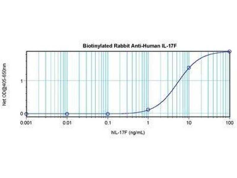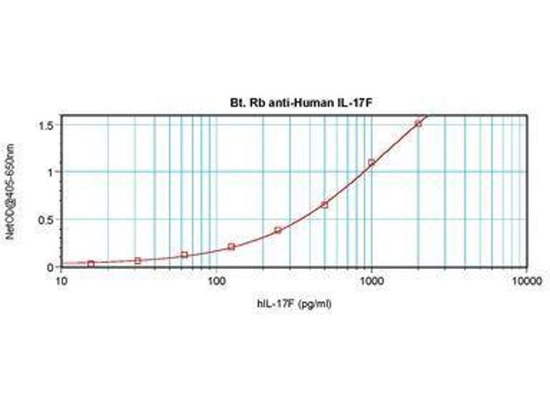 Usage: The applications listed have been tested for the unconjugated form of this product. Other forms have not been tested. ELISA: To detect hIL-17F by direct ELISA (using 100 μL/well antibody solution) a concentration of 0.25-1 μg/mL of this antibody is required. This biotinylated polyclonal antibody, in conjunction with compatible secondary reagents, allows the detection of at least 0.2-0.4 ng/well of recombinant hIL-17F. To detect hIL-17F by sandwich ELISA (using 100 μL/well antibody solution) a concentration of 0.25-1 μg/mL of this antibody is required. This biotinylated polyclonal antibody, in conjunction with Polyclonal Anti-Human IL-17F (LS-C104732) as a capture antibody, allows the detection of at least 0.2-0.4 ng/well of recombinant hIL-17F. Western Blot: To detect hIL-17F by Western Blot analysis this antibody can be used at a concentration of 0.1-0.2 μg/mL. Used in conjunction with compatible secondary reagents the detection limit for recombinant hIL-17F is 1.5-3 ng/lane, under either reducing or non-reducing conditions. -