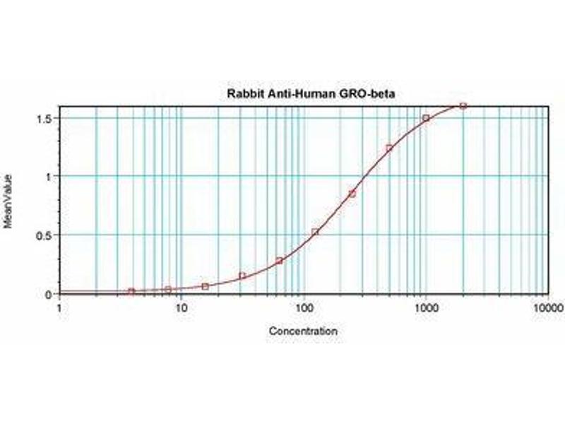 Usage: Immunohistochemistry: This antibody stained formalin-fixed paraffin-embedded sections of human colon/rectum adenocarcinoma tissue. The recommended concentration is 1 μg/mL with an overnight incubation at 4 °C. An HRP-labeled polymer detection system was used with a DAB chromogen. Heat induced antigen retrieval with a pH 6 sodium citrate buffer is recommended. Optimal concentrations and conditions may vary. ELISA: To detect Human GRO-beta by sandwich ELISA (using 100 μL/well antibody solution) a concentration of 0.5-2 μg/mL of this antibody is required. This antigen affinity purified antibody, in conjunction with Biotinylated Anti-Human GRO-beta (LS-C104838) as a detection antibody, allows the detection of at least 0.2-0.4 ng/well of recombinant Human GRO-beta. Western Blot: To detect human GRO-beta by Western Blot analysis this antibody can be used at a concentration of 0.1-0.2 μg/mL. When used in conjunction with compatible secondary reagents, the detection limit for recombinant Human GRO-beta is 1.5-3 ng/lane, under either reducing or non-reducing conditions. -
