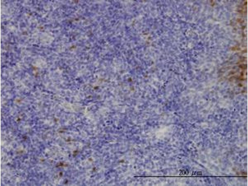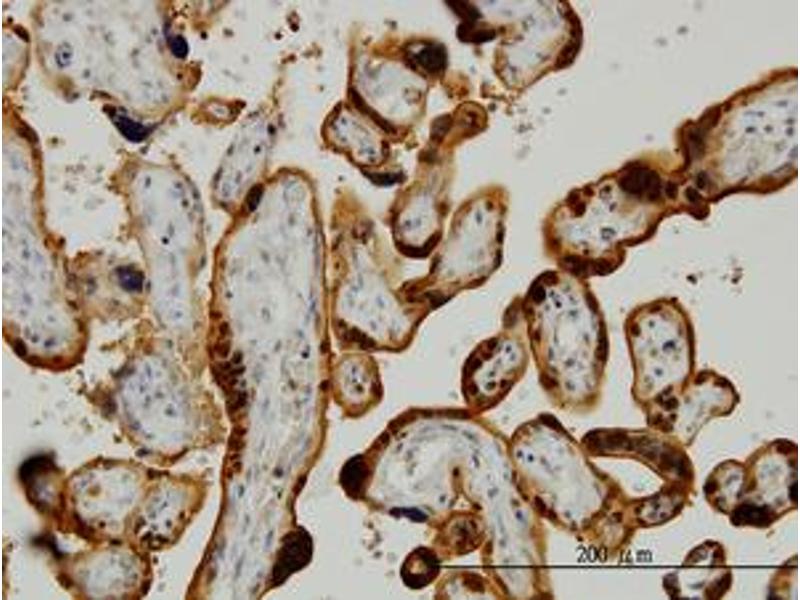 Usage: Western Blot (Cell lysate) - positive control A-431. Western Blot (Transfected lysate) - positive control transfected 293T cell line. Immunohistochemistry (Formalin/PFA-fixed paraffin-embedded sections, 3 μg/mL) - positive control human placenta. Immunohistochemistry (Formalin/PFA-fixed paraffin-embedded sections, 3 μg/mL) - positive control human tonsil. Immunofluorescence (15 μg/mL) - positive control HeLa cells. Sandwich ELISA (Recombinant protein).