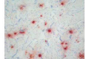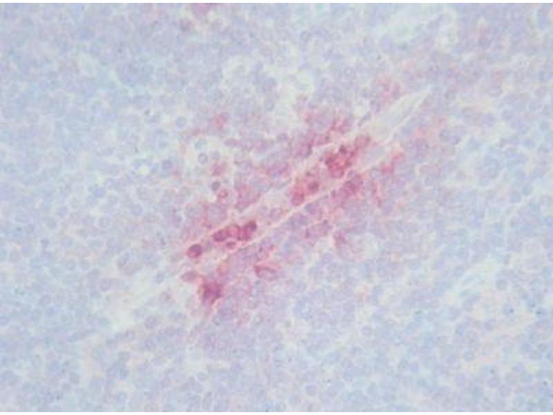 Several defensins are recognized, the epitope has not been further characterized. Biological functions: Various functions have been described for defensins. They are antibacterial, antifungal, chemotactic for monocytes, inhibitory for ACTH-induced corticosteroid synthesis and cytotoxic for cells. Defensins are inhibited by glucosaminoglycans (self protection for cells) and high concentrations of Calpha 2+ ions. Biochemistry: Defensins are a group of cyclic peptides containing 29-35 amino acids (MW < 3500) which tend to form aggregates. The molecules are protease resistant. The defensin content of azurophilic granules in neutrophils is approximately 30 % of the total protein. Specificity: Human: Defensin 1-3 (HNP-1 to HNP-3) in human neutrophils. Synthetic defensin-1 and -2 (Bachem, Bubendorf CH) stain also positively. Not tested with Defensin-4. A side reaction to elastin has been observed in humans. Other: not tested. Defensins have been described in rabbits (NP-1 to NP-5, NP3a = Corticostatin), and in mice (cryptodin).
