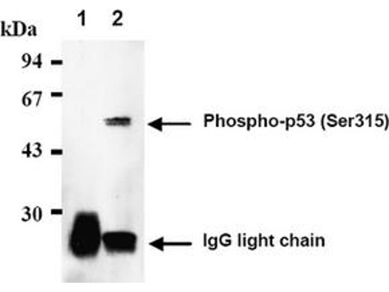 - Immunoprecipitation / SDS PAGE & Western Blotting1) Wash the cells 3 times with PBS and suspend with 10 volumes of cold Lysis buffer (50mM Tris-HCl, pH 7. 2, 250 mM NaCl, 0. 1% NP-40, 2 mM EDTA, 10% glycerol) containingappropriate protease inhibitors. Incubate it at 4°C with rotating for 30 minutes, thensonicate briefly (up to 10 seconds). 2) Centrifuge the tube at 12,000 x g for 10 minutes at 4°C and transfer the supernatant toanother tube. 3) Add 100 µL of the anti-p53 monoclonal antibody into 200 µL of the supernatant. Mix welland incubate with gentle agitation for 30-120 minutes at 4°C. Add 20 µL of 50% ProteinA-agarose beads resuspended in the Lysis buffer. Mix well and incubate with gentleagitation for 60 minutes at 4°C. 4) Wash the beads 3-5 times with ice-cold Lysis buffer centrifuge the tube at 2,500 x g for10 seconds). 5) Resuspend the beads in 20 ìL of Laemmli’s sample buffer, boil for 3-5 minutes, andcentrifuge for 5 minutes. Load 10 µL of the sample per lane in a 1 mm thickSDS-polyacrylamide gel for electrophoresis. 6) Blot the protein to a polyvinylidene difluoride (PVDF) membrane at 1 mA/cm2 for 1 hourin a semi-dry transfer system. (Transfer Buffer: 25 mM Tris, 190 mM glycine, 20% MeOH). See the manufacture's manual for specific transfer procedure. 7) To reduce nonspecific binding, soak the membrane in 10% skimmed milk (in PBS, pH7. 2) for 1 hour at room temperature, or overnight at 4°C. 8) Incubate the membrane with the anti-phospho p53 Ser315 monoclonal antibody (5µg/mL) diluted with 1% skimmed milk (in PBS, pH 7. 2) for 1 hour at room temperature. 9) Wash the membrane with PBS (5 minutes x 6 times). 10) Incubate the membrane with the 1: 10000 POD-conjugated anti-mouse IgG ê dilutedwith 1% skimmed milk (in PBS, pH 7. 2) for 1 hour at room temperature. 11) Wash the membrane with PBS (5 minutes x 6 times)12) Wipe excess buffer from the membrane, then incubate it with appropriatechemiluminescence reagents for 1 minute. Remove extra reagent from the membrane bydabbing with a paper towel, and seal it in plastic wrap. 13) Expose to X-ray film in a dark room for 5 minutes. Develop the film as usual. Theconditions for exposure and development may vary. Positive control for Immunoprecipitation/Western blotting: Raji cells