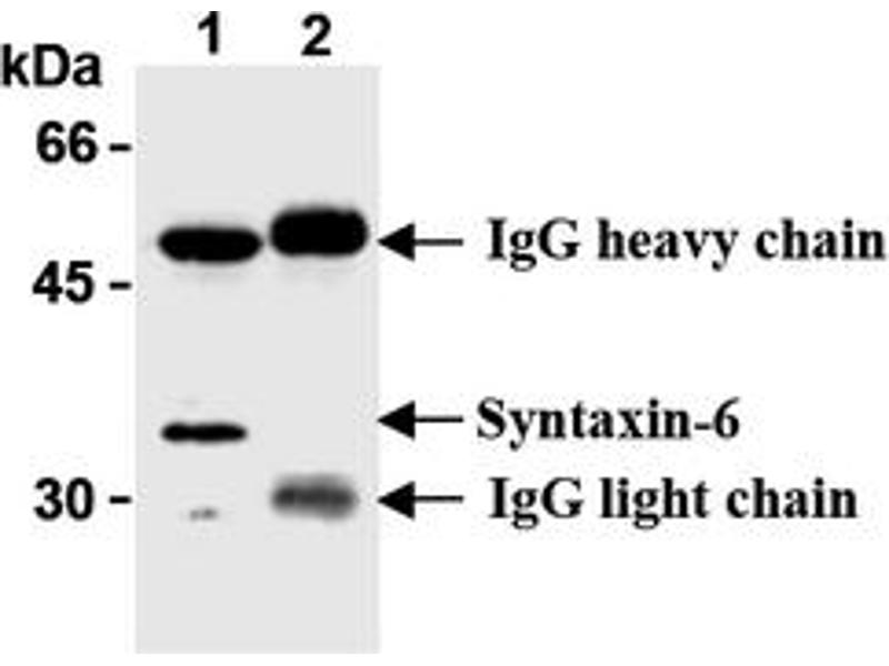 - This antibody reacts with 31 kDa membrane protein Syntaxin-6 on Western blotting and Immunoprecipitation. It is reported that this monoclonal antibody (3D10) binds to the amino-terminal 25 amino acid of Rat Syntaxin-6 (Ref.6). Detects a band of approximately 35 kDa (predicted molecular weight: 30.6 kDa).