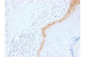 - Keratins are a family of intermediate filament proteins that assemble into filaments through forming heterodimers of one type I keratin (keratins 9 to 23) and one type II keratin (keratins 1 to 8). Keratins demonstrate tissue and differentiation specific expression profiles. Keratin 15 is a type I keratin which is expressed only in basal keratinocytes in stratified epithelia and does not appear to have a natural type II expression partner. Keratin 15 is down regulated in activated keratinocytes. Cytokeratin 15 is a specific marker of stem cells of the hair-follicle bulge and may be a useful marker for diagnosis between basal cell carcinoma (BCC) and trichoepithelioma. Trichoblastoma are benign neoplasms of follicular differentiation frequently found in nevus sebaceous. Many morphologic features are shared with nodular basal cell carcinoma, sometimes rendering a diagnosis difficult. Trichoblastoma and BCC show variable expression of Cytokeratin 15 and Cytokeratin 19, and absence of hair keratins.