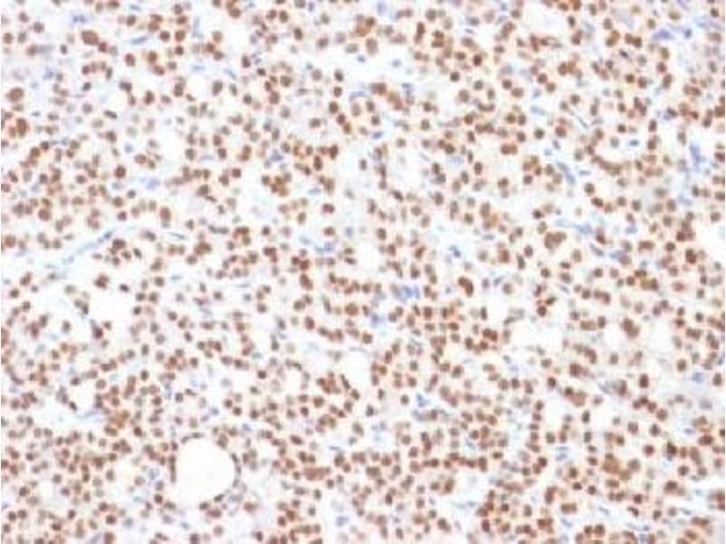 PAX8 is a member of the paired box (PAX) family of transcription factors. Members of this gene family typically encode proteins which contain a paired box domain, an octapeptide, and a paired-type homeodomain. The PAX gene family has an important role in the formation of tissues and organs during embryonic development and maintaining the normal function of some cells after birth. The PAX genes give instructions for making proteins that attach themselves to certain areas of DNA. This nuclear protein is involved in thyroid follicular cell development and expression of thyroid-specific genes. PAX8 releases the hormones important for regulating growth, brain development, and metabolism. Also functions in very early stages of kidney organogenesis, the müllerian system, and the thymus. Additionally, PAX8 is expressed in the renal excretory system, epithelial cells of the endocervix, endometrium, ovary, Fallopian tube, seminal vesicle, epididymis, pancreatic islet cells and lymphoid cells. PAX8 and other transcription factors play a role in binding to DNA and regulating the genes that drive thyroid hormone synthesis (Tg, TPO, Slc5a5 and Tshr).