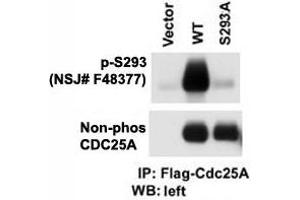 This phospho-CDC25A antibody was produced from rabbits immunized with a KLH conjugated synthetic phosphopeptide corresponding to amino acid residues surrounding pS293 of human CDC25A.