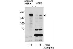 This phospho-HER3 antibody was produced from rabbits immunized with a KLH conjugated synthetic phosphopeptide corresponding to amino acid residues surrounding pY1289 of human HER3/ERBB3.