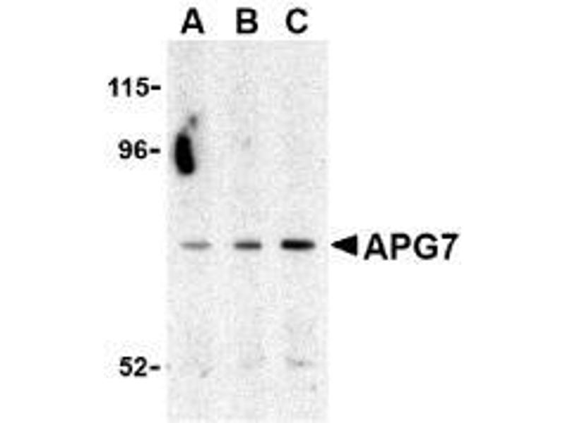 ELISA. Western blot: APG7 antibody can be used for the detection of APG7 at 0.5-1 μg/mL. Positive Control: Caco-2 Cell Lysate. Immunocytochemistry. Positive Control: MCF7 Cell Lysate.