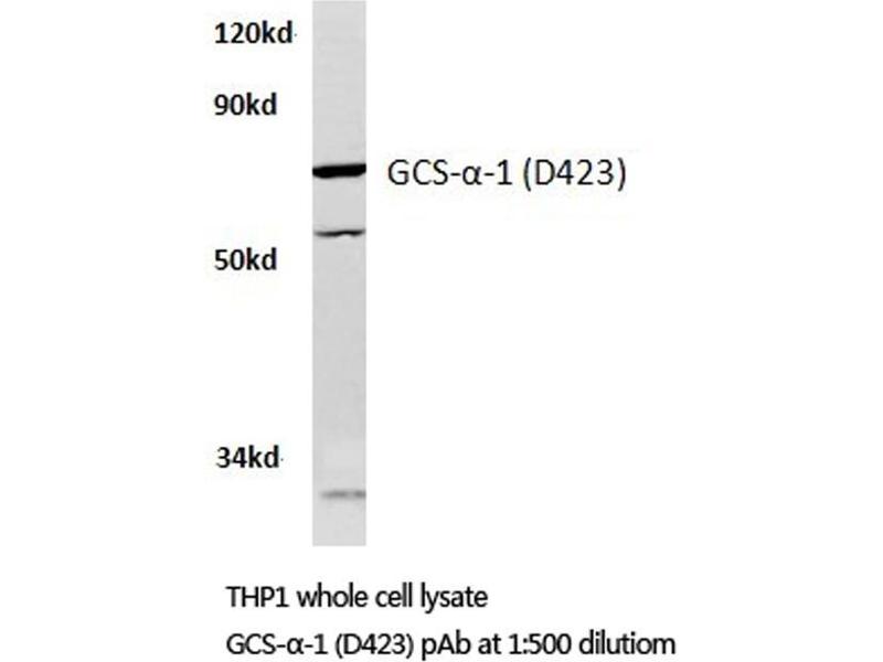 Guanylate cyclases belong to the adenylyl cyclase class-4/guanylyl cyclase family. There are two forms of guanylate cyclase. The soluble form, known as GCS or sGC, act as receptors for nitric oxide. The membrane-bound receptor form, known as GC, are peptide hormone receptors. GCS is a cGMP-synthesizing enzyme, which is the major receptor for the neurotransmitter nitric oxide (NO). It plays a crucial role in smooth muscle contractility, platelet reactivity and neurotransmission. GCS is a heme containing heterodimer, consisting of one 72 kDa alpha subunit and one 65 kDa beta subunit. The heme moeity mediates NO activation, and this heme group also binds carbon monoxide, which weakly stimulates the enzyme. Both NO and CO stimulation are enhanced by the allosteric activator 3-(5'-hydroxymethyl-2'furyl)-benzylindazole, YC-1. YC-1 can also stimulate GCS in a NOindependent manner. Both alpha and beta subunits are required for cGMP generation, and at least two isoforms exist for each subunit. Heterodimers consisting of alpha-1/beta-1 and alpha-2/beta-1 have been identified, and both display similar enzymatic activity.Synonyms: GCS-alpha-1, GCS-alpha-3, GUC1A3, GUCSA3, GUCY1A1, Guanylate cyclase soluble subunit alpha-3, Soluble guanylate cyclase large subunit, sGC alpha