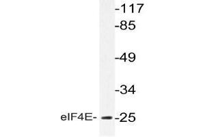 EIF4E, a protein modulates translation of maternal mRNAs in early embryos before the onset of zygotic transcription. eIF4E also influences the overall rate of translation. eIF4E binds to the 7 methyl GTP cap structure of eukaryotic mRNAs. Phosphorylation of eIF4E on serine 209 regulates the affinity of this protein for the 7 methyl GTP cap and/or RNA. Phosphorylation also enhances the interaction of eIF4E with eIF4G, which form a complex known as eIF4F. eIF4E phosphorylation is correlated with increased translational rate in a number of cell types. Several kinases are currently being investigated as potential regulators of eIF4E including PKC and/or the MAP kinase activated Mnk.Synonyms: EIF-4E, EIF4EL1, EIF4F, Eukaryotic translation initiation factor 4E, eIF-4F 25 kDa subunit, mRNA cap-binding protein