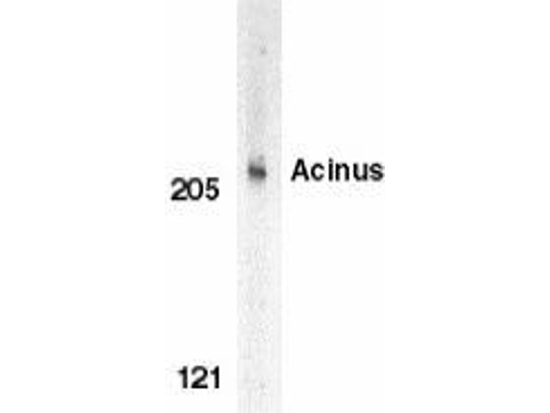 ELISA. Western Blot: Acinus antibody can be used for detection of Acinus at 0.5 to 1 μg/mL. Anapproximate 220 kDa band can be detected. Immunocytochemistry. Other applications not tested. Optimal dilutions are dependent on conditions and should be determined by the user.